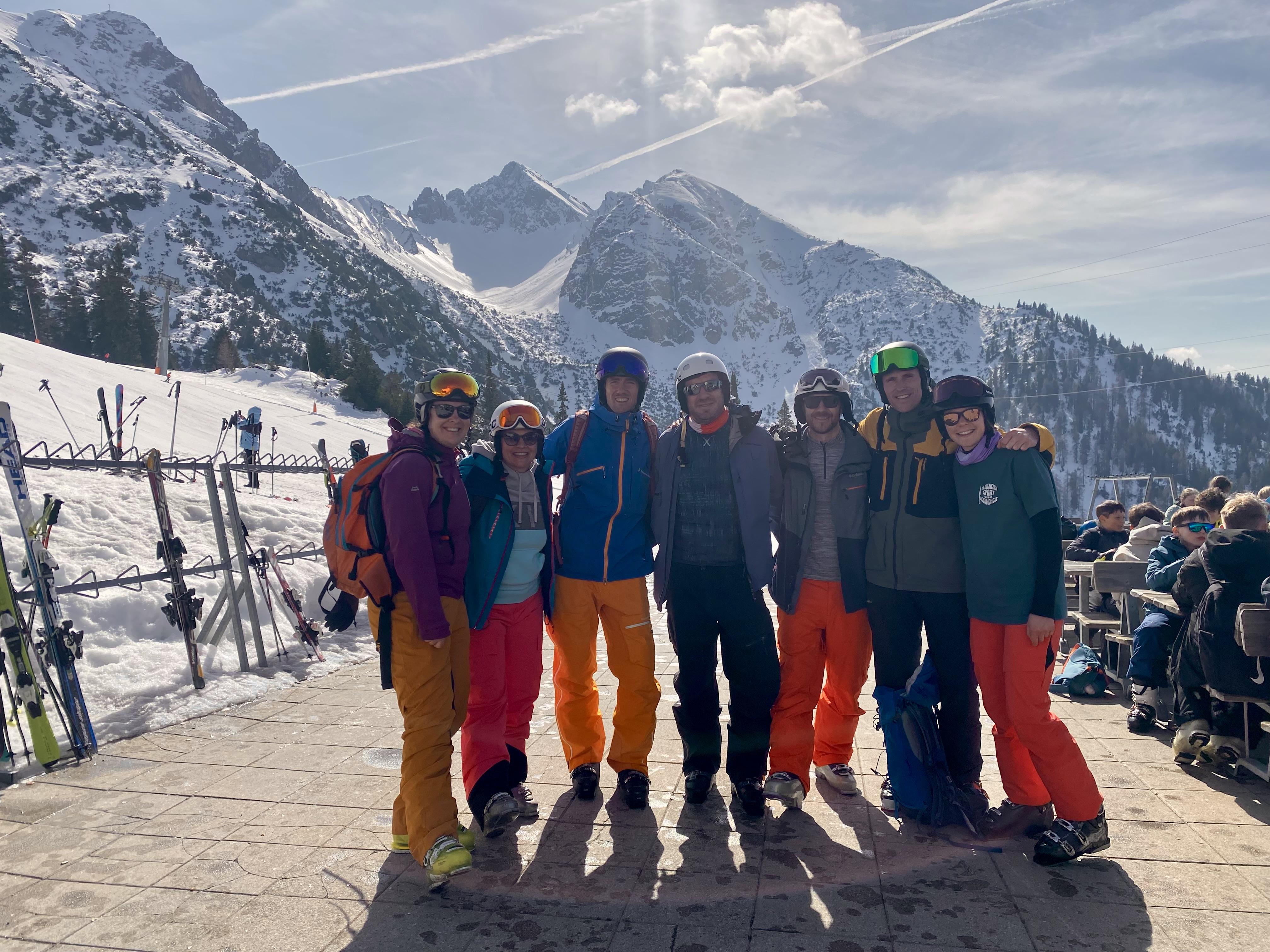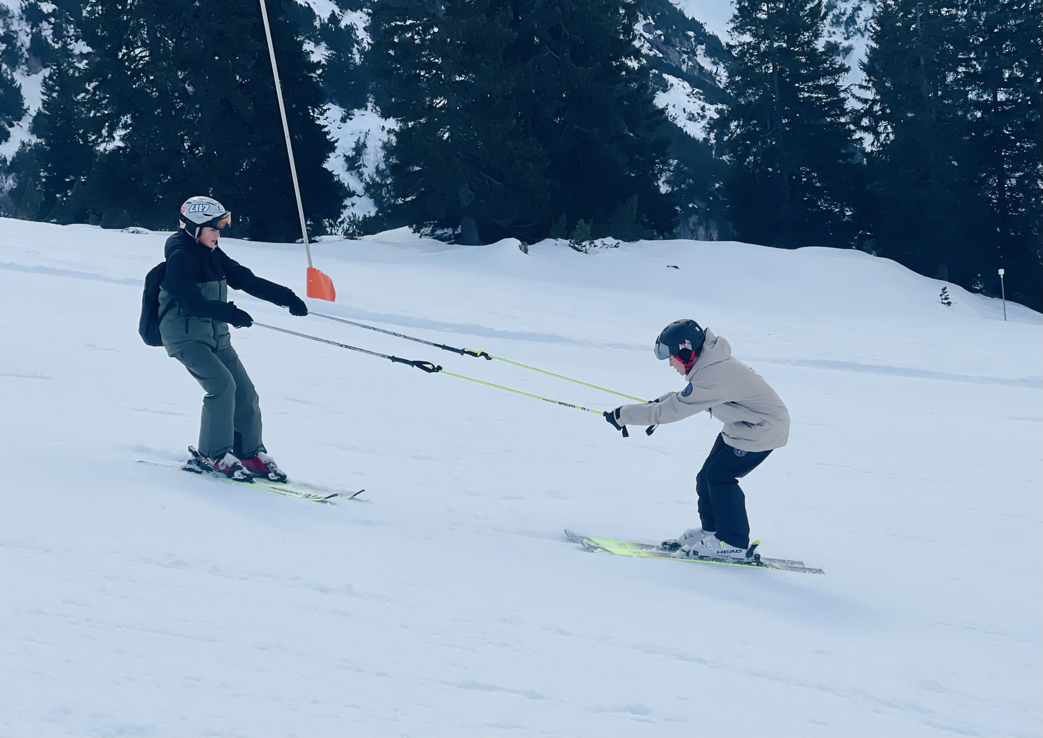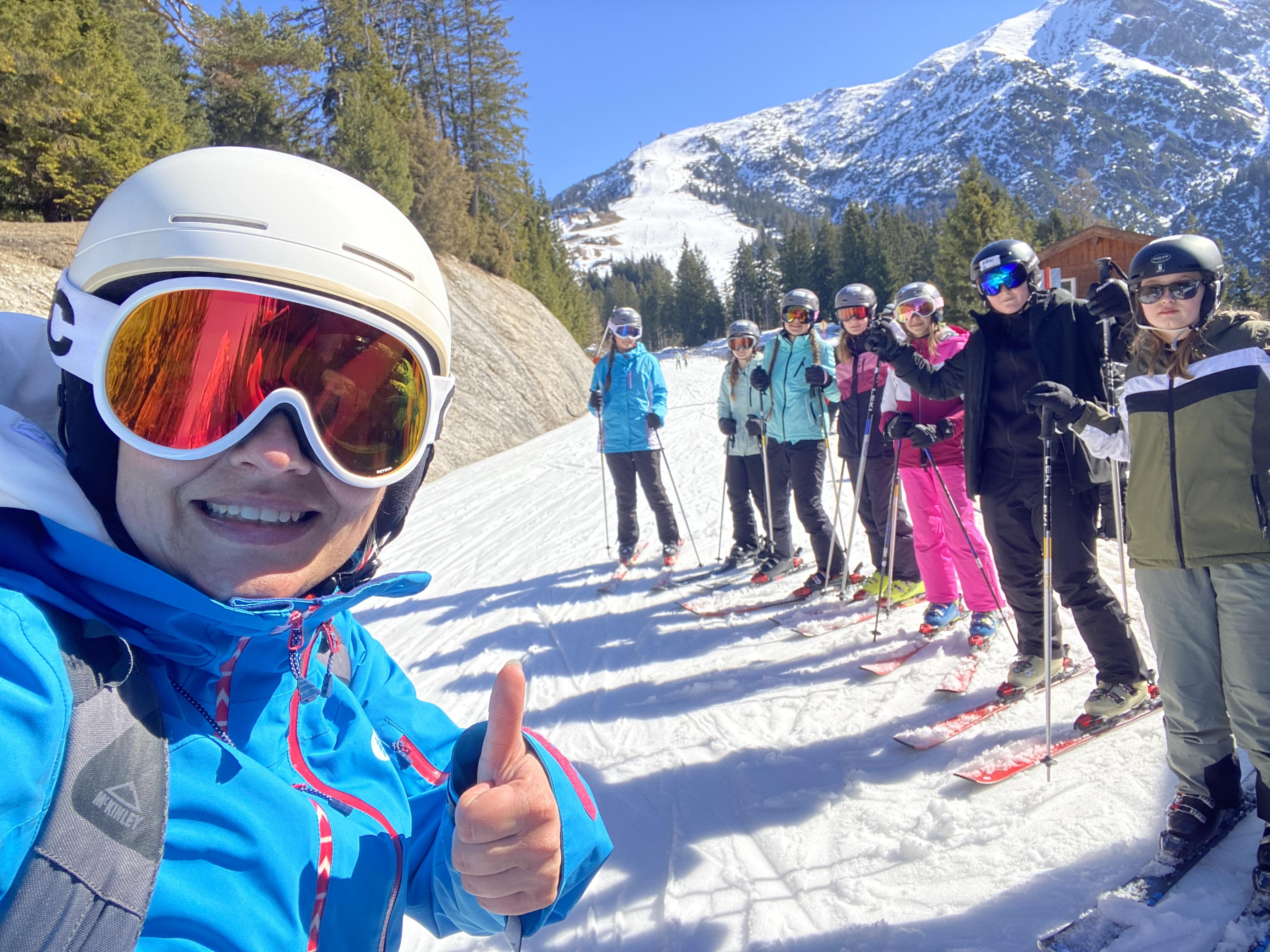Für viele begann das Abenteuer ganz bei null: Skier an- und abschnallen, das Gleichgewicht halten, bremsen und schließlich die ersten Kurven fahren - all das wollte erst einmal gelernt sein. Doch mit viel Geduld, gegenseitiger Unterstützung und einer guten Portion Mut wagten sich die Anfänger auf die ersten Abfahrten im Kinderland. Schon bald ging es mit Schlepp- und Sesselliften hinauf auf den Berg, bevor Talabfahrten und rote, später sogar schwarze Pisten bezwungen wurden. Ganz andere Herausforderungen meisterten unterdessen unsere Skiprofis: sauberes Aufkanten, stabile Körperhaltung und Kurzschwünge mit Stockeinsatz - und natürlich auch der ein oder andere Sprung über einen Kicker oder wildes Kreiseln im Schnee. Nach all der Aufregung sorgten Hüttenpausen mit Schnitzel, Pommes und Kaiserschmarrn für neue Energie zwischen den Abfahrten - stets begleitet von einem beeindruckenden Blick auf die umliegenden Berge.
