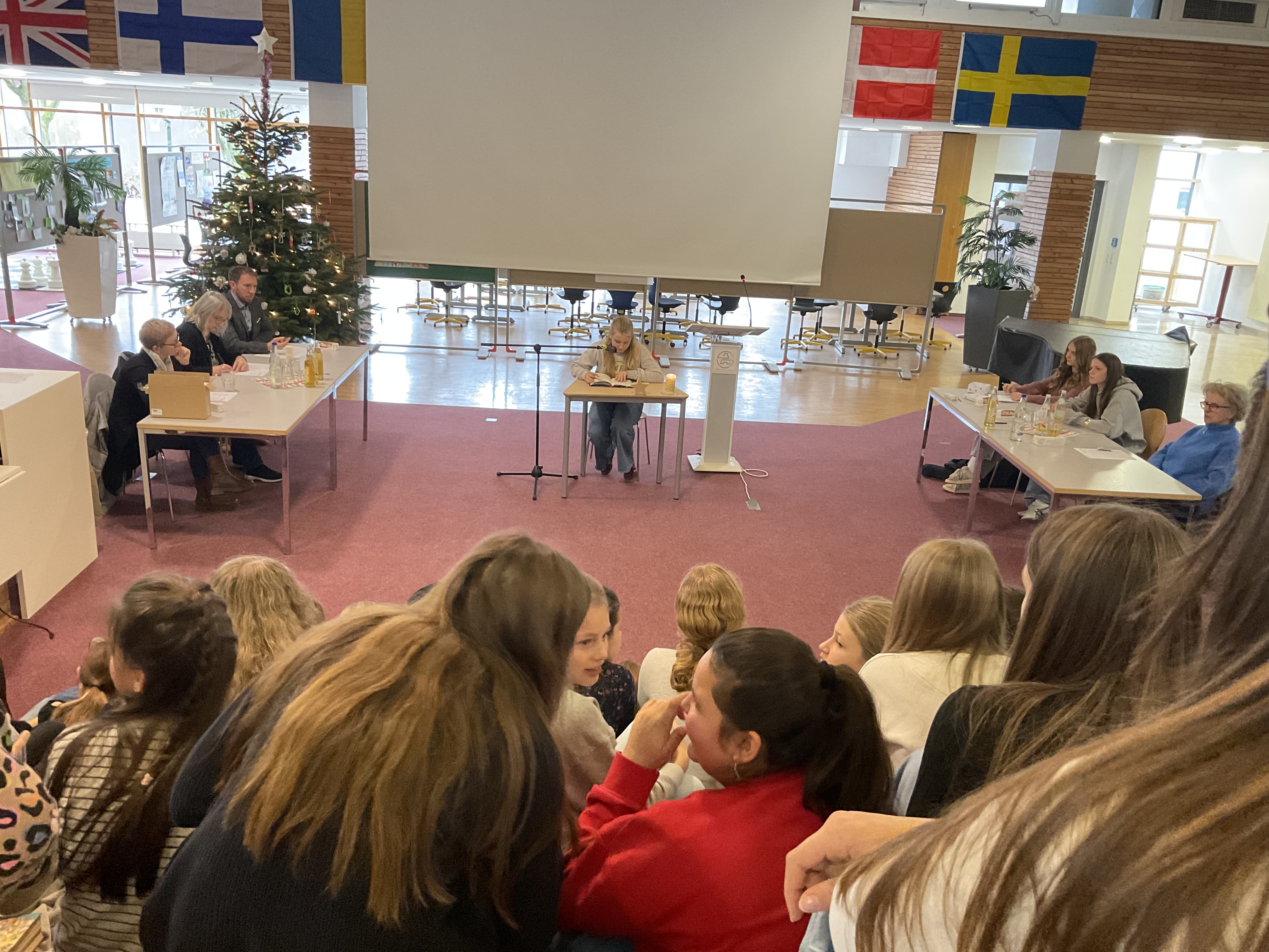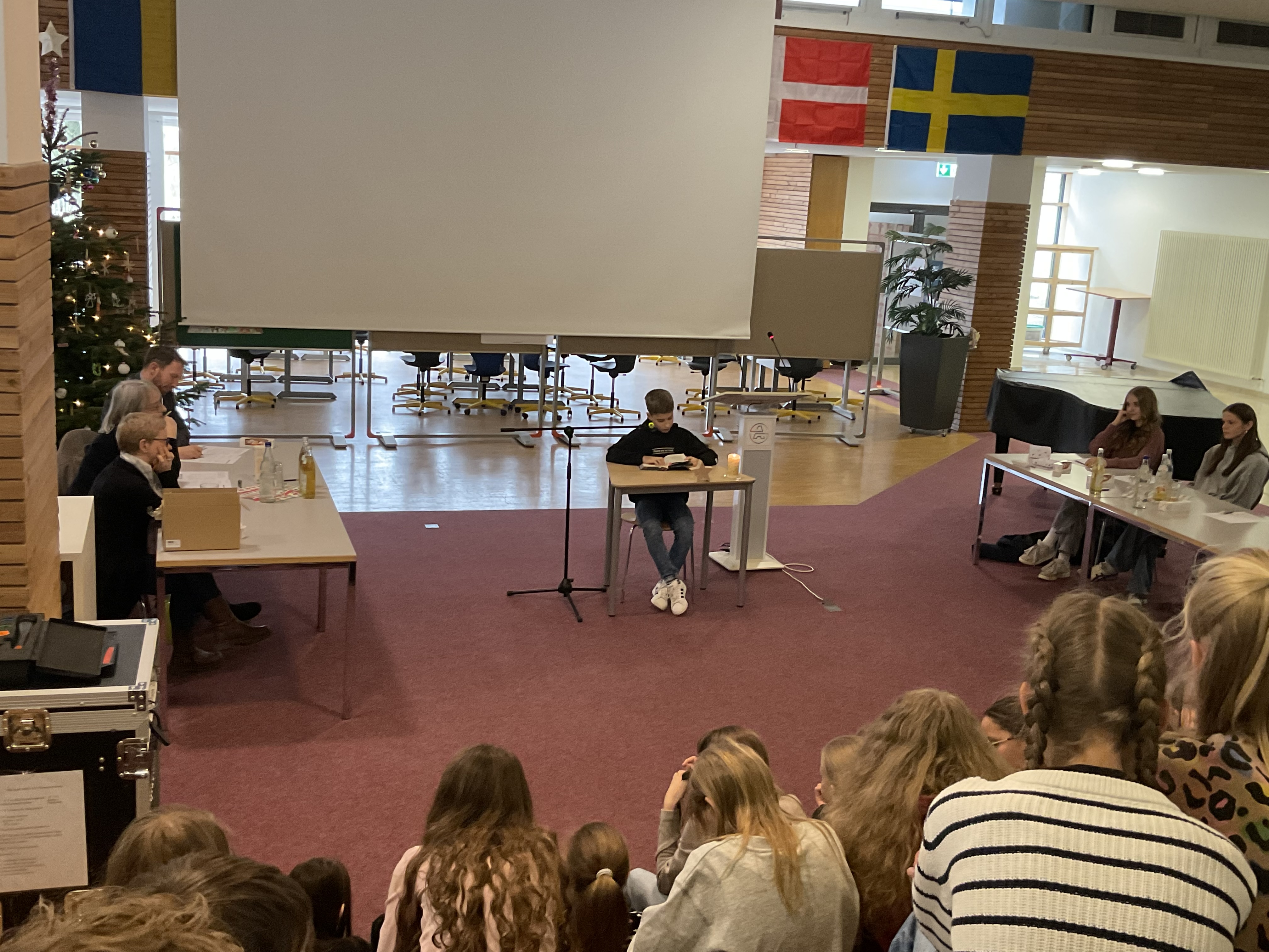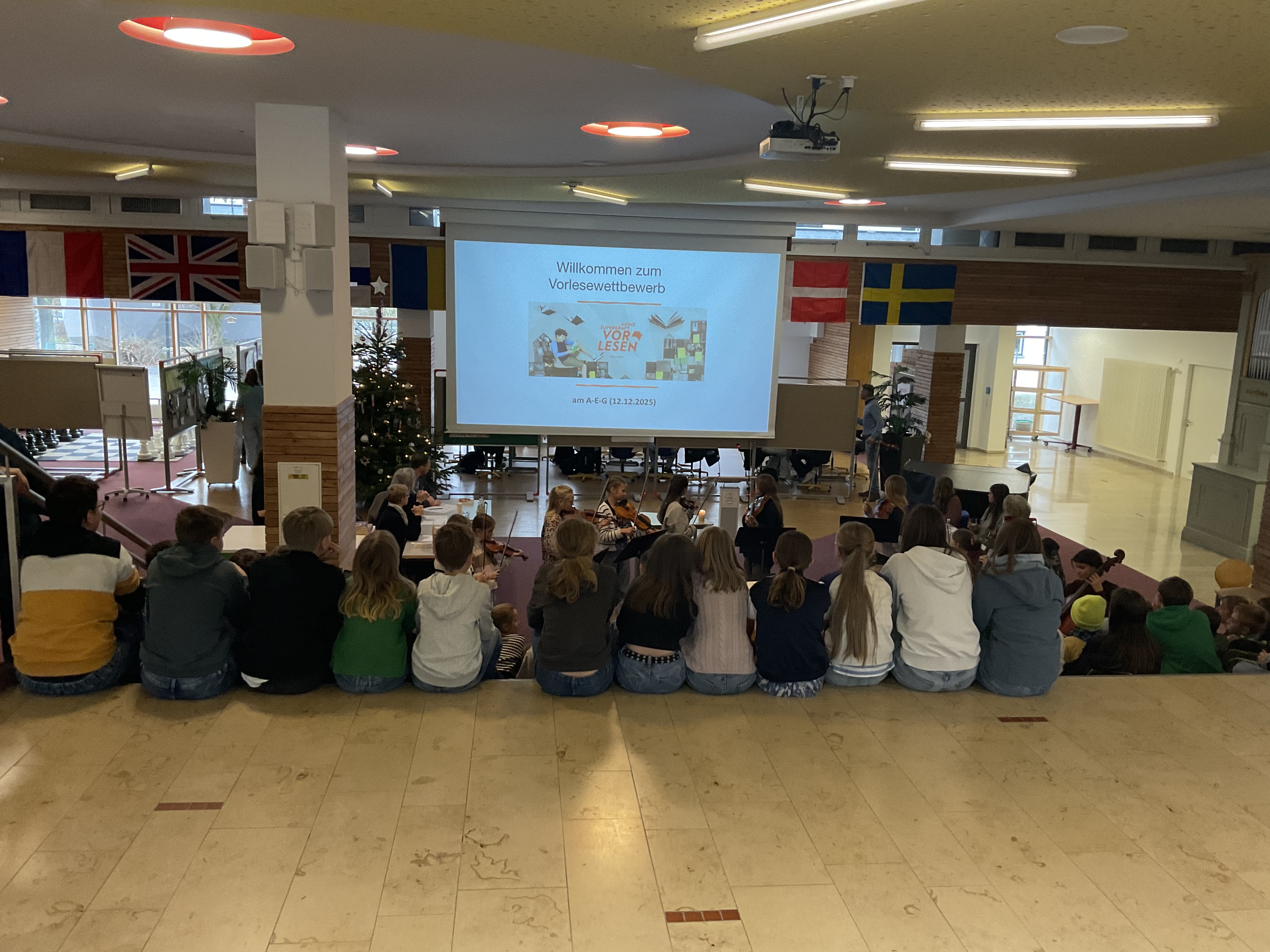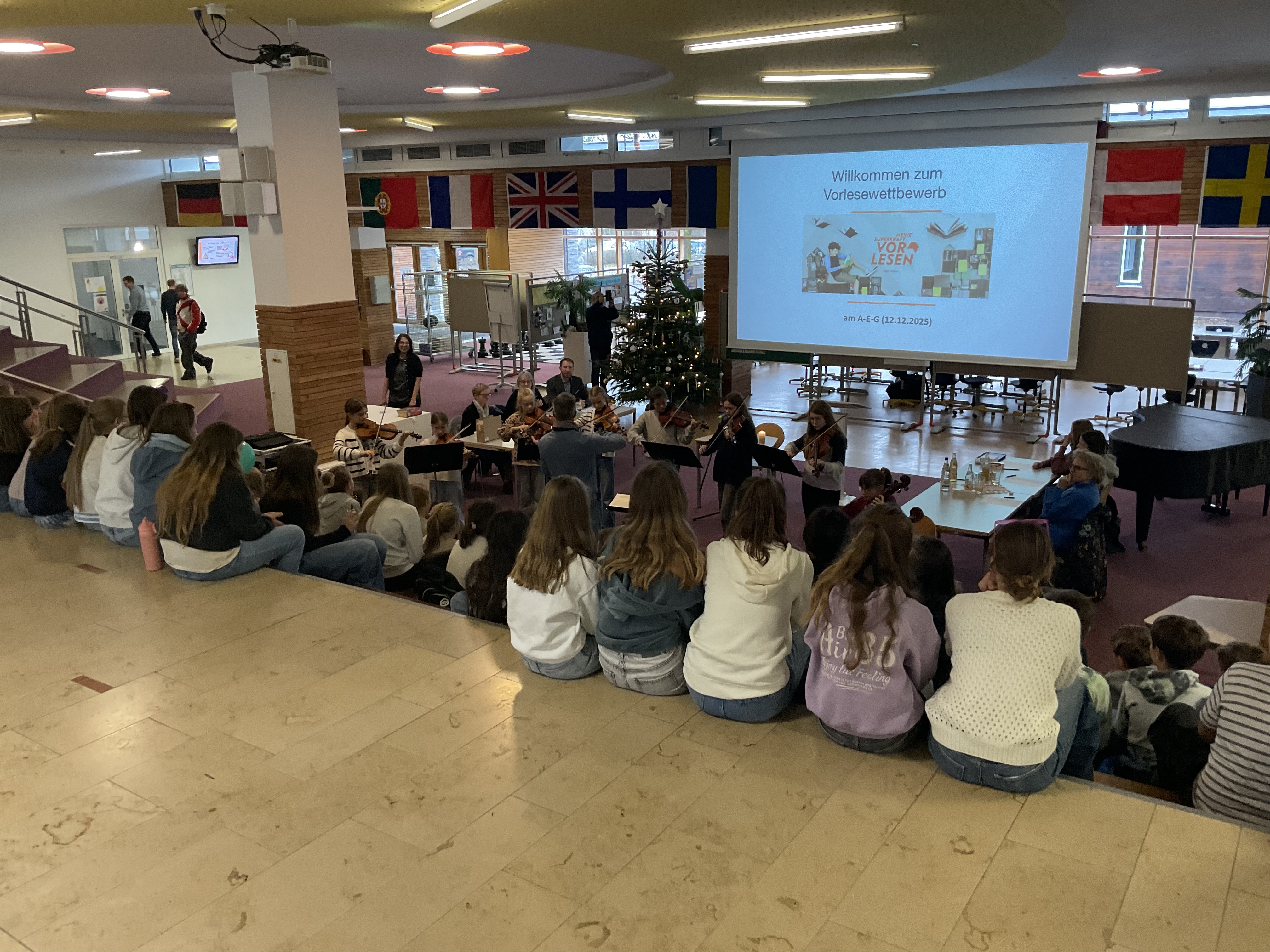 Doch bevor die Vorlesenden ihr Können zeigten, sorgten die Schülerinnen der Streichergruppe der Klasse 6a unter der Leitung von Günter Simon für ein musikalisches Highlight. Sie spielten zwei Weihnachtslieder auf ihren Streichinstrumenten und stimmten so Publikum und Jury auf den Wettbewerb ein.