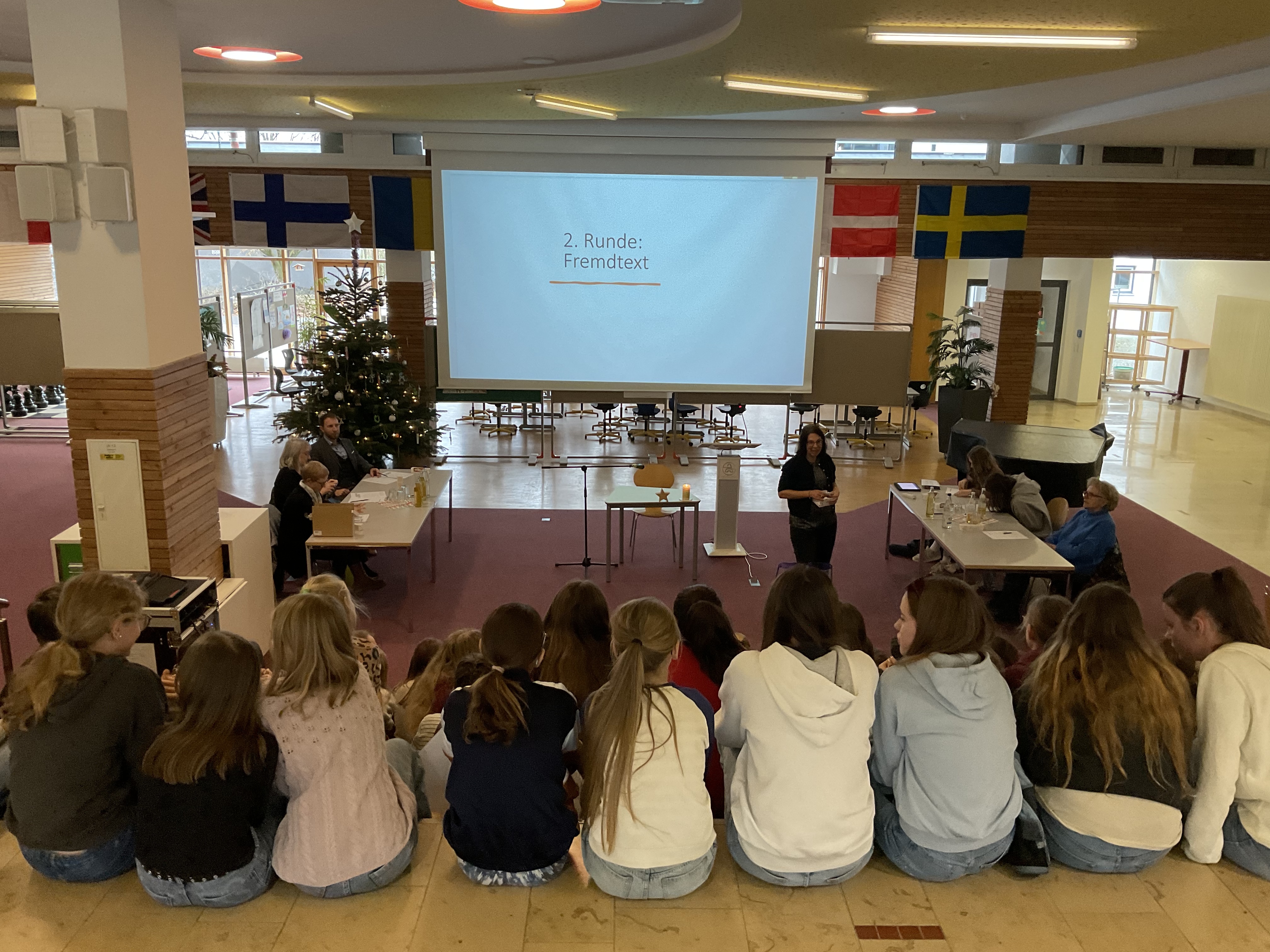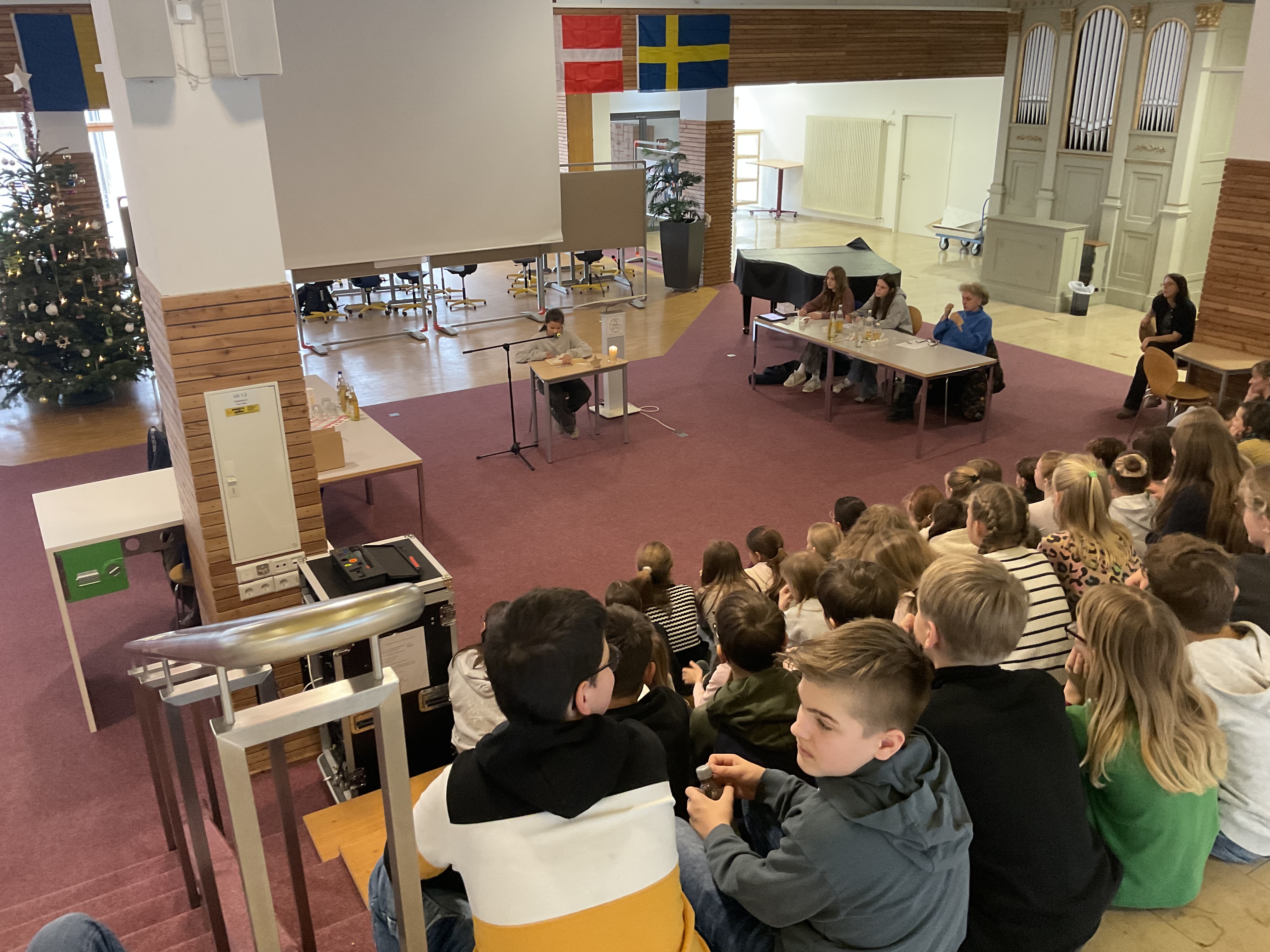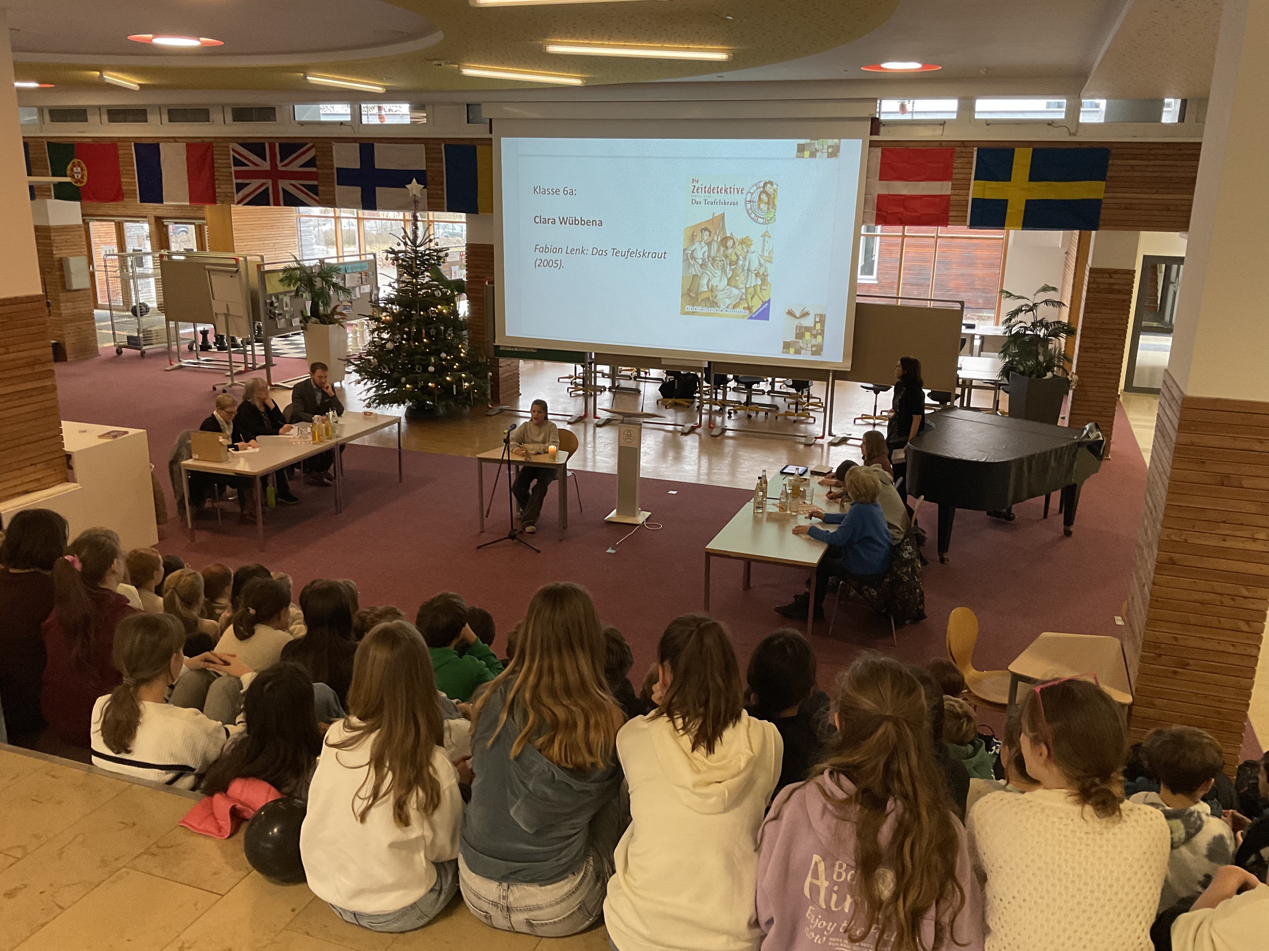 Doch bevor die Vorlesenden ihr Können zeigten, sorgten die Schülerinnen der Streichergruppe der Klasse 6a unter der Leitung von Günter Simon für ein musikalisches Highlight. Sie spielten zwei Weihnachtslieder auf ihren Streichinstrumenten und stimmten so Publikum und Jury auf den Wettbewerb ein.
