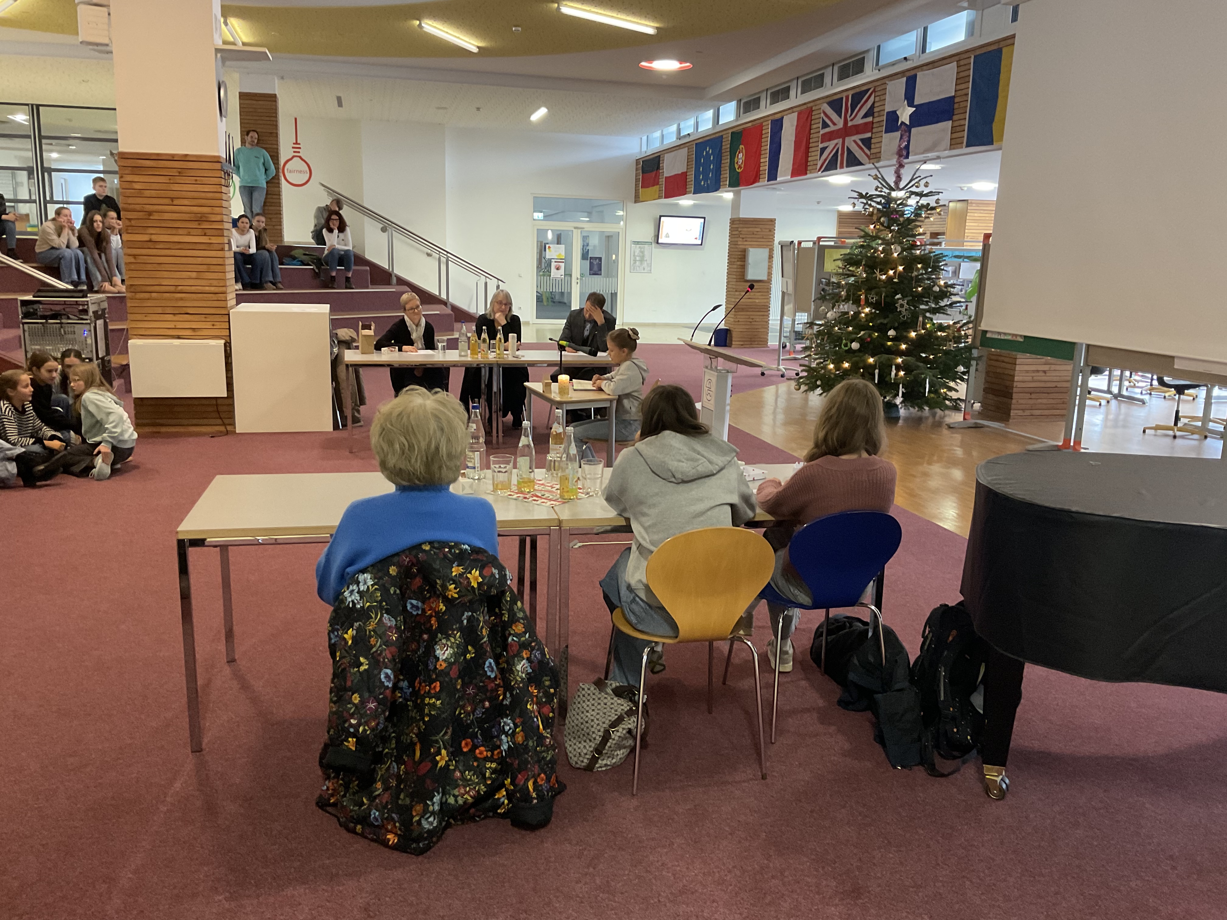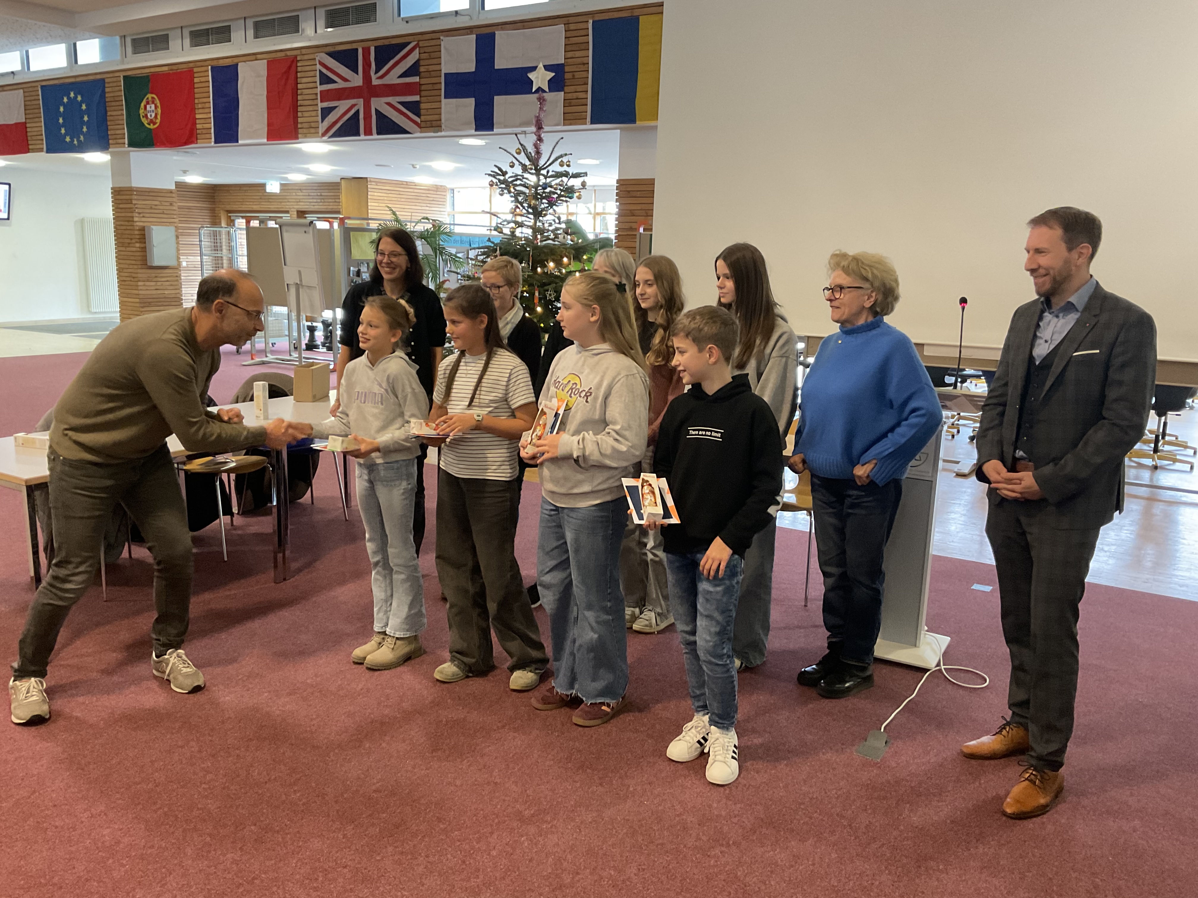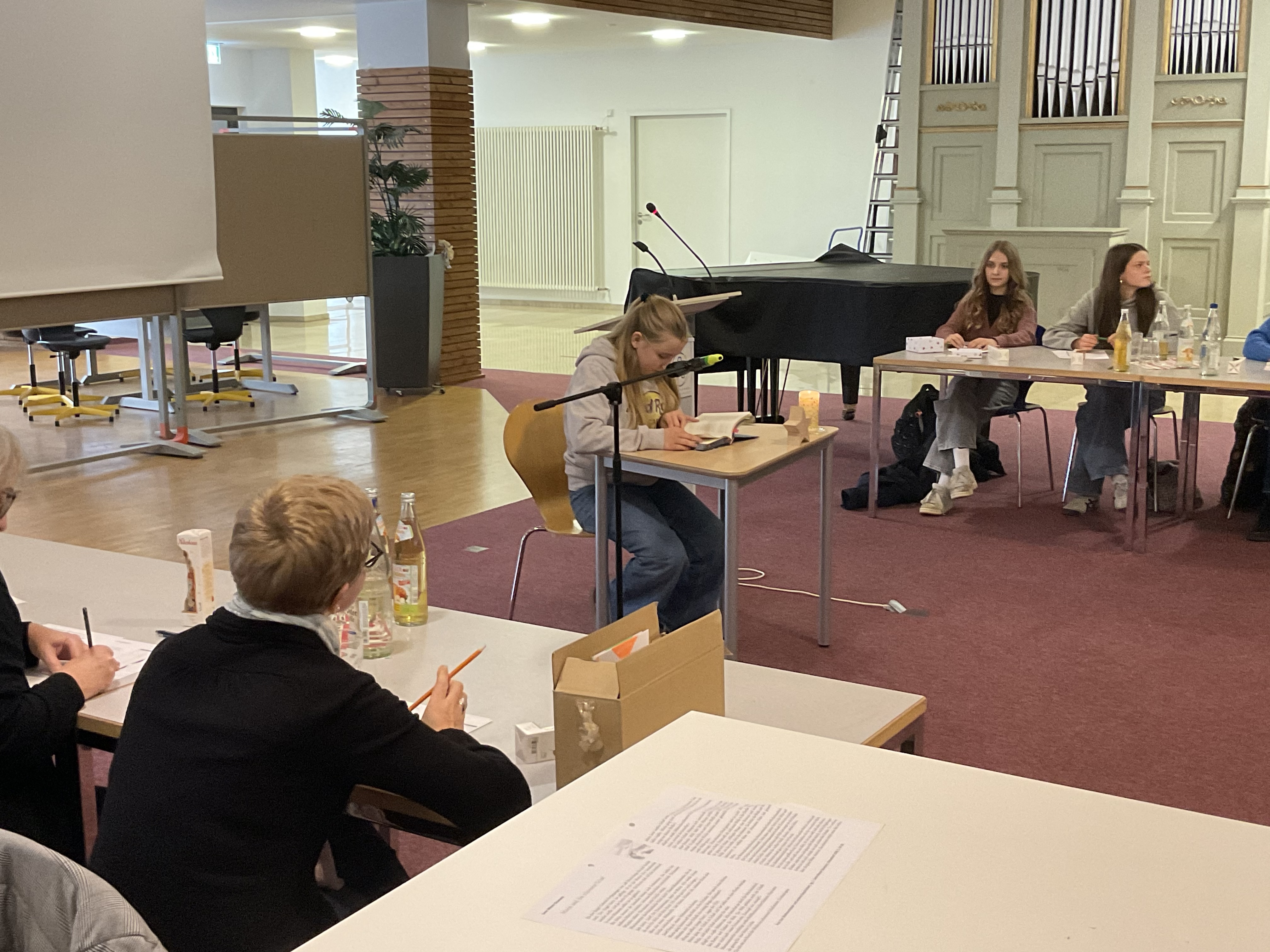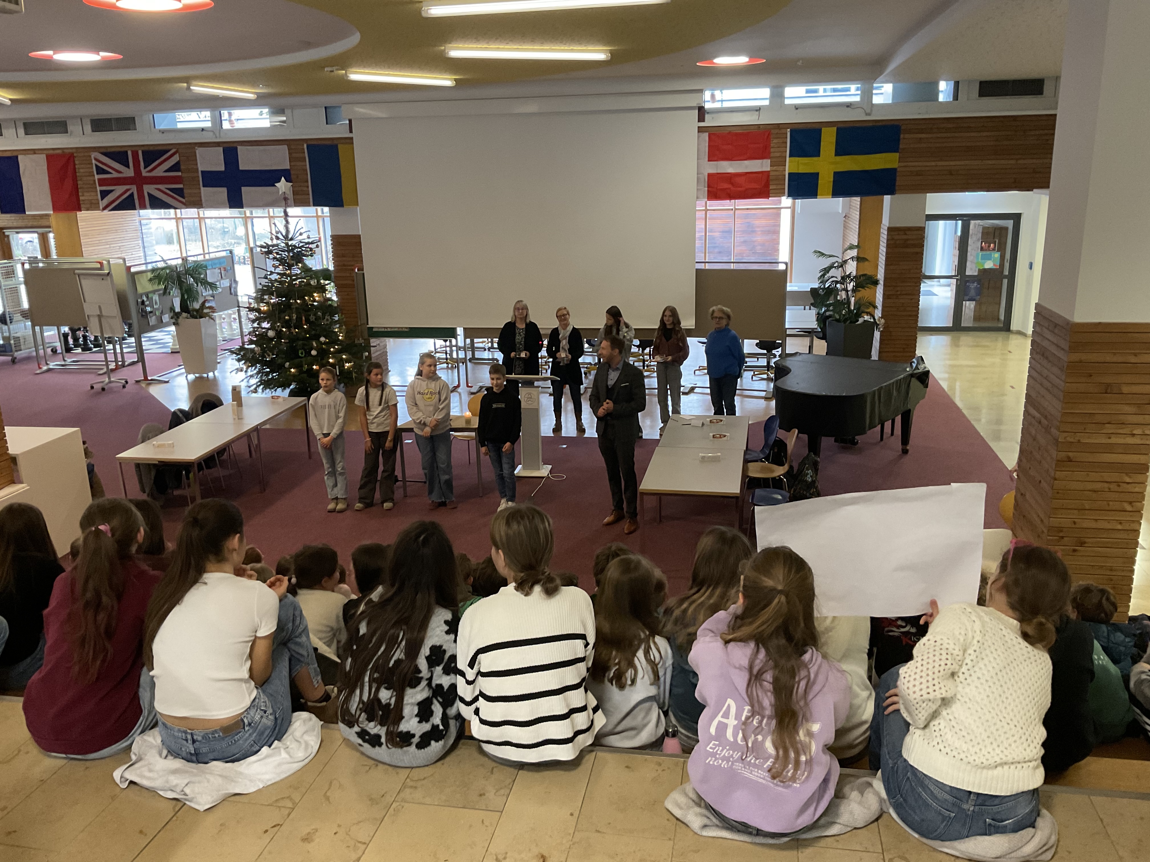 Doch bevor die Vorlesenden ihr Können zeigten, sorgten die Schülerinnen der Streichergruppe der Klasse 6a unter der Leitung von Günter Simon für ein musikalisches Highlight. Sie spielten zwei Weihnachtslieder auf ihren Streichinstrumenten und stimmten so Publikum und Jury auf den Wettbewerb ein.