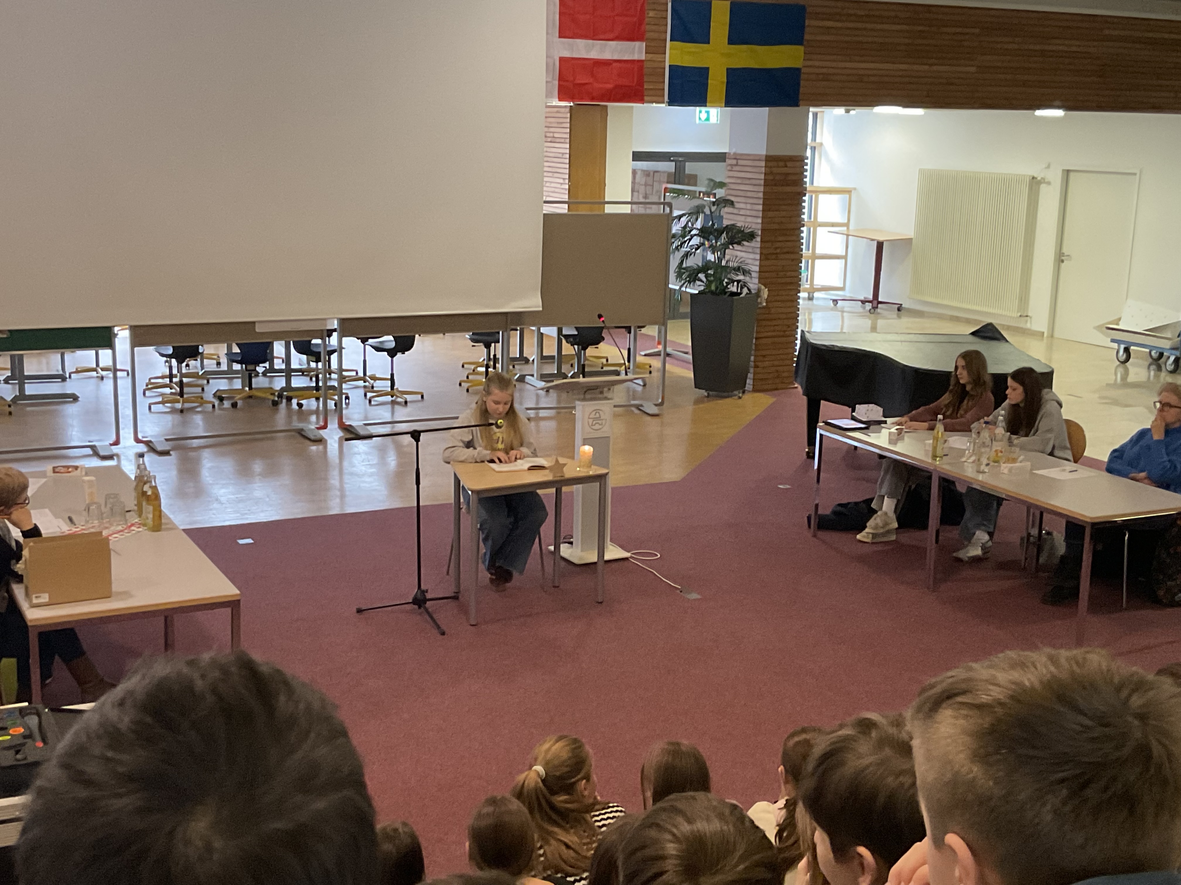 Clara Wübbena aus der Klasse 6a stellte ihr Können mit einem Auszug aus Fabian Lenks Buch „Das Teufelskraut“ unter Beweis. Annie Stöckle aus der 6b zog das Publikum mit ihrer ausdrucksstarken Interpretation eines Buches aus der Reihe „Die drei Ausrufezeichen“ von Maja Vogel in den Bann. Frieda Leis aus der 6c begeisterte mit einer lebendigen und humorvollen Lesung aus „Wie gewonnen, so zerronnen“ von Kai Pannen. David Hertle aus der 6d schließlich nahm das Publikum mit in die Welt des Romans „Schlamassel im Weltall“ von YouTube-Künstler Paluten.