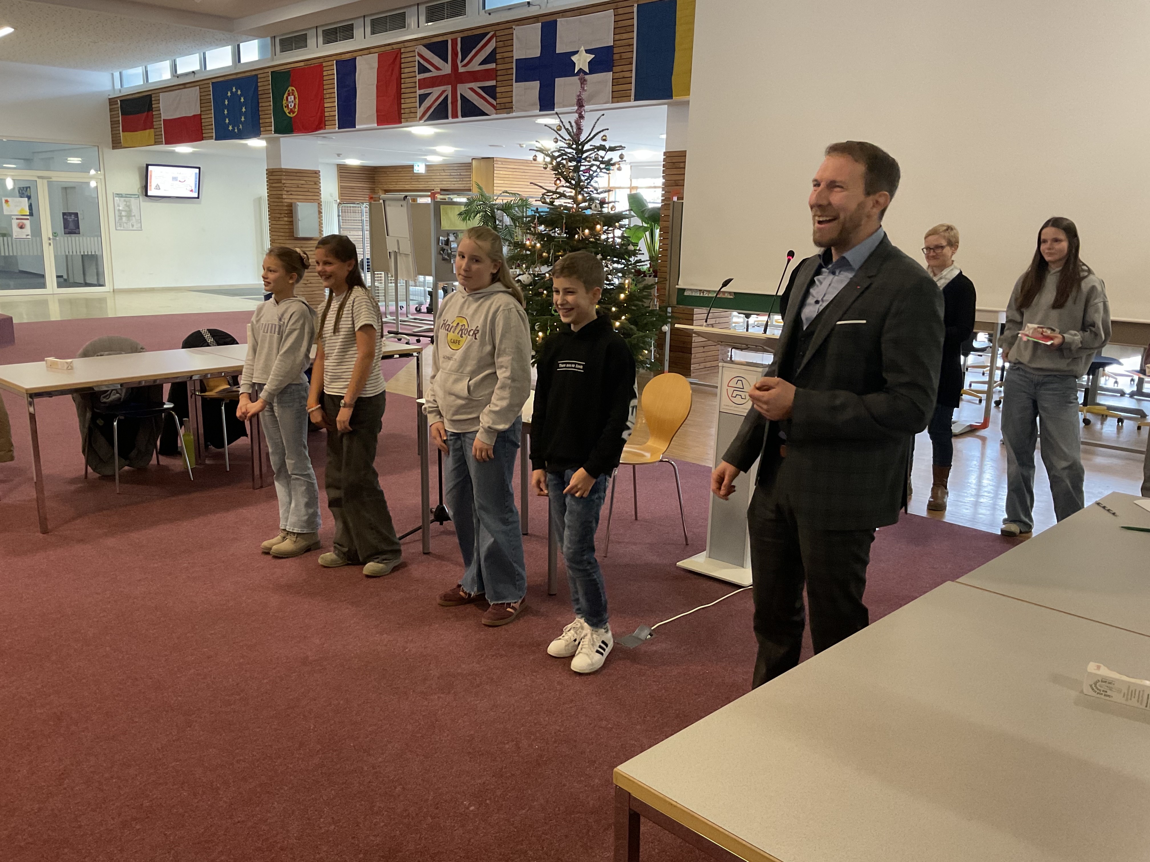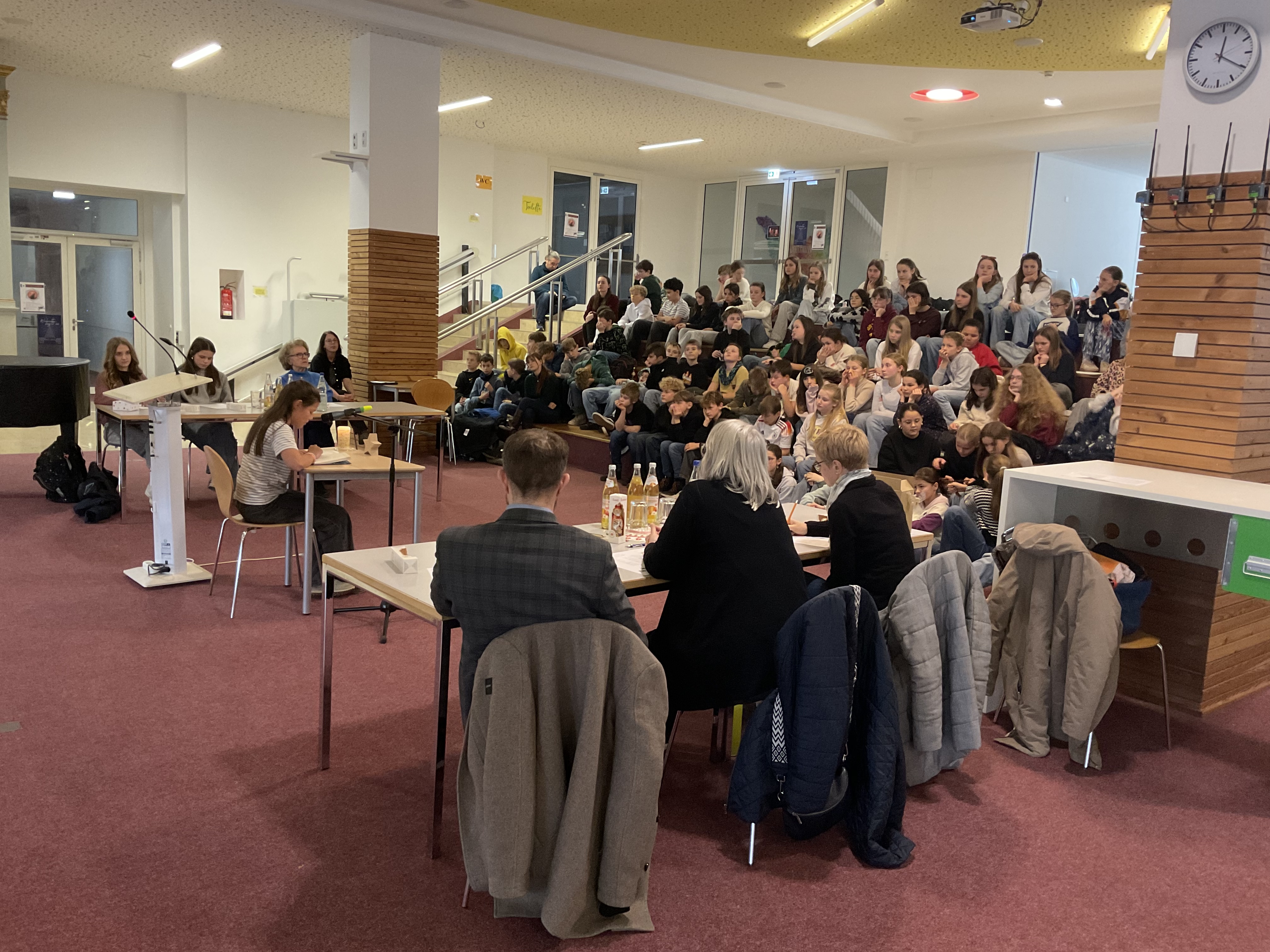 Schließlich gab er auch die Entscheidung der Jury bekannt, die nicht leichtgefallen war: Annie Stöckle konnte sich den Schulsieg sichern. Doch eigentlich waren alle vier Teilnehmerinnen und Teilnehmer Gewinner, denn sie begeisterten ihr Publikum.