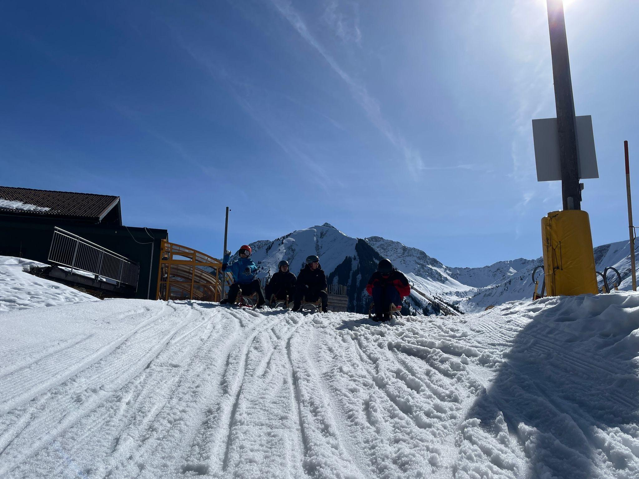 Trotz ein paar Schlafmützen an Bord startete ein Bus engagierter Schüler gut gelaunt Richtung Berwang. Während die Skifahrer bei bestem Wetter die Skipiste genießen konnten, zwang die vereiste Rodelbahn die Rodler zum sofortigen Boxenstopp auf der Hütte - oh wie schade! Nach den ersten heiklen Abfahrten wurde auch das Fahrgefühl der Rodler sicherer.