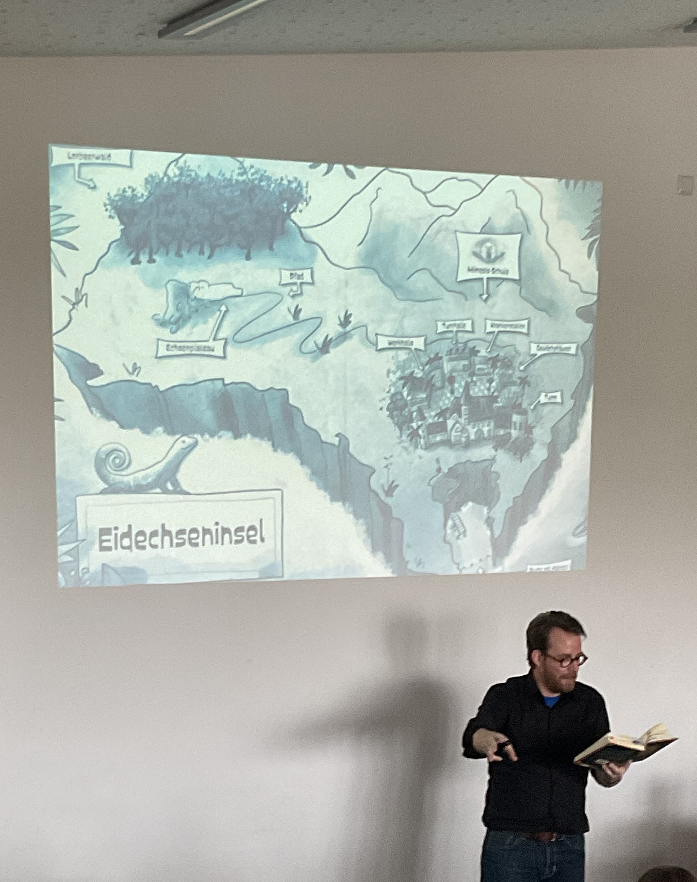 Mit viel Humor und Nähe zu seinem Publikum sprach Büchel die Kinder als „Kollegen“ an und zog sie durch Fragen und lebendige Erzählweise aktiv in die Lesung ein. Seine Geschichte rund um eine geheimnisvolle Insel, künstliche Kinder und moderne Technik regte zum Nachdenken an. Dabei spannte er den Bogen zur Realität und verdeutlichte, wie schnell sich die Welt durch Technik und Künstliche Intelligenz verändert.
